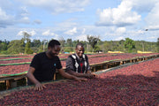 Farmers from Okoluu deliver hand-picked coffee cherries directly from their farms to the Suke Quto processing site. Upon delivery, workers sort out underripe, overripe, and pest-damaged coffee cherries by hand, ensuring that only perfectly ripe cherries make their way onto the raised drying beds. Here, they dry under the sun for 18 to 21 days, with workers manually turning the cherries six times daily to promote even drying. At night, the cherries are covered with nylon mesh and plastic to prevent pest damage and rehydration from dew. Workers carefully monitor the cherry's moisture loss after 15 days and pull finished cherries off the beds when they reach an ideal moisture level between 9.5 and 10.5 percent.
